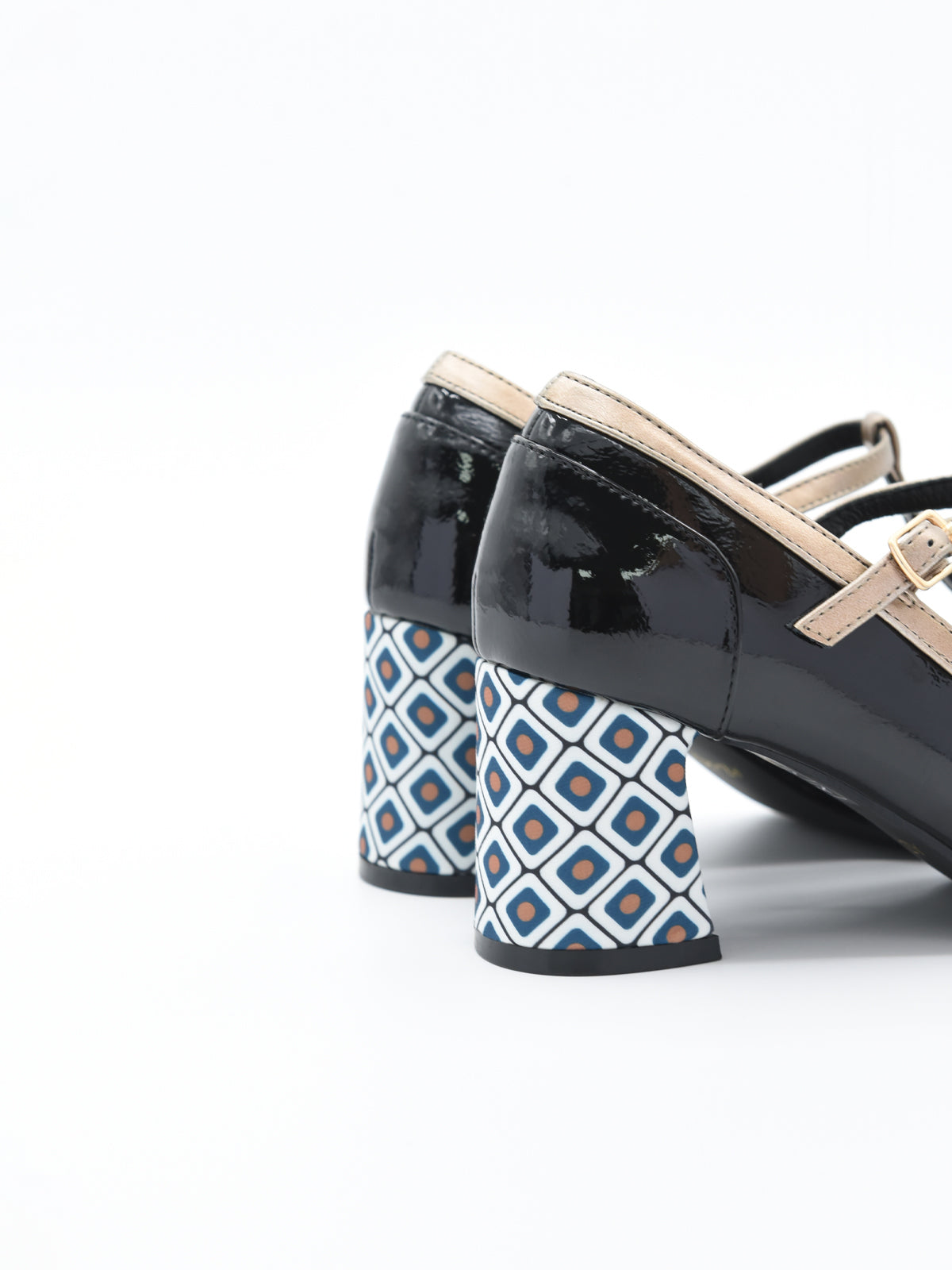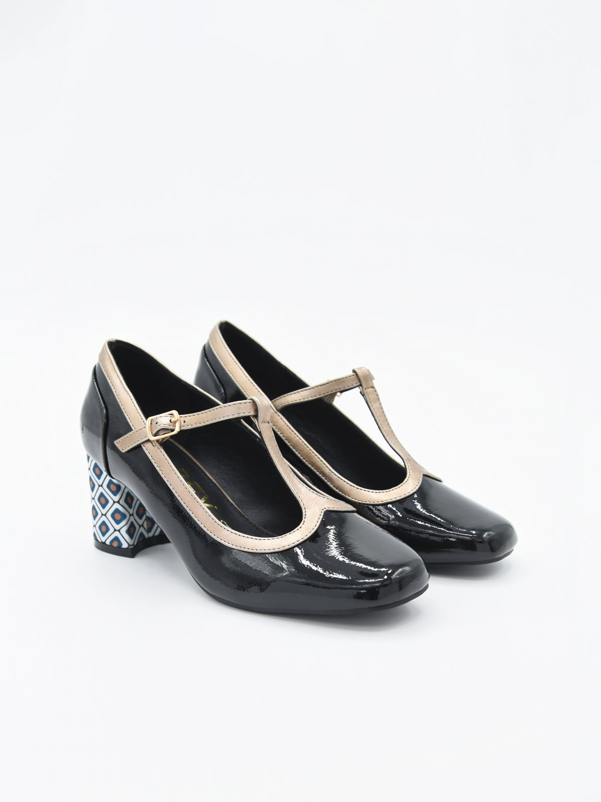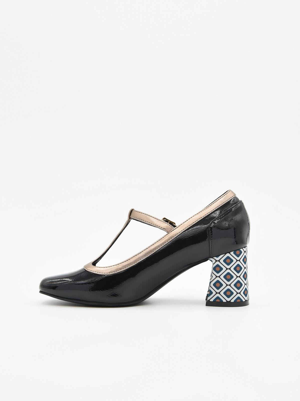 Esse zSalão preto Apato Com detalhes dourados e Calcanhar impresso É uma jóia real do estilo retro chique. O acabamento Lango preto brilhante, combinado com o Pulseira de barra t metálica, destaca a feminilidade com um ar sofisticado e alegre.