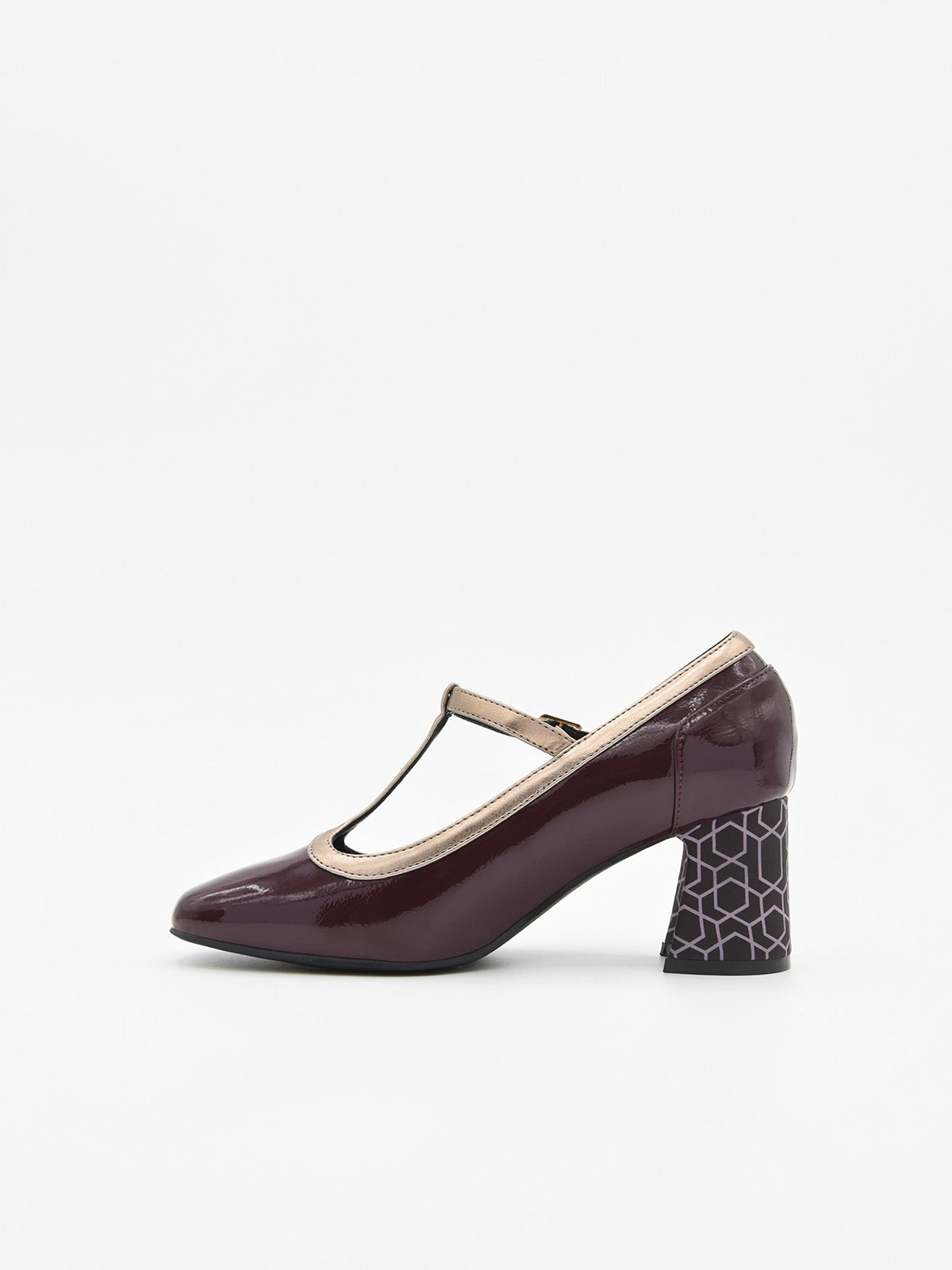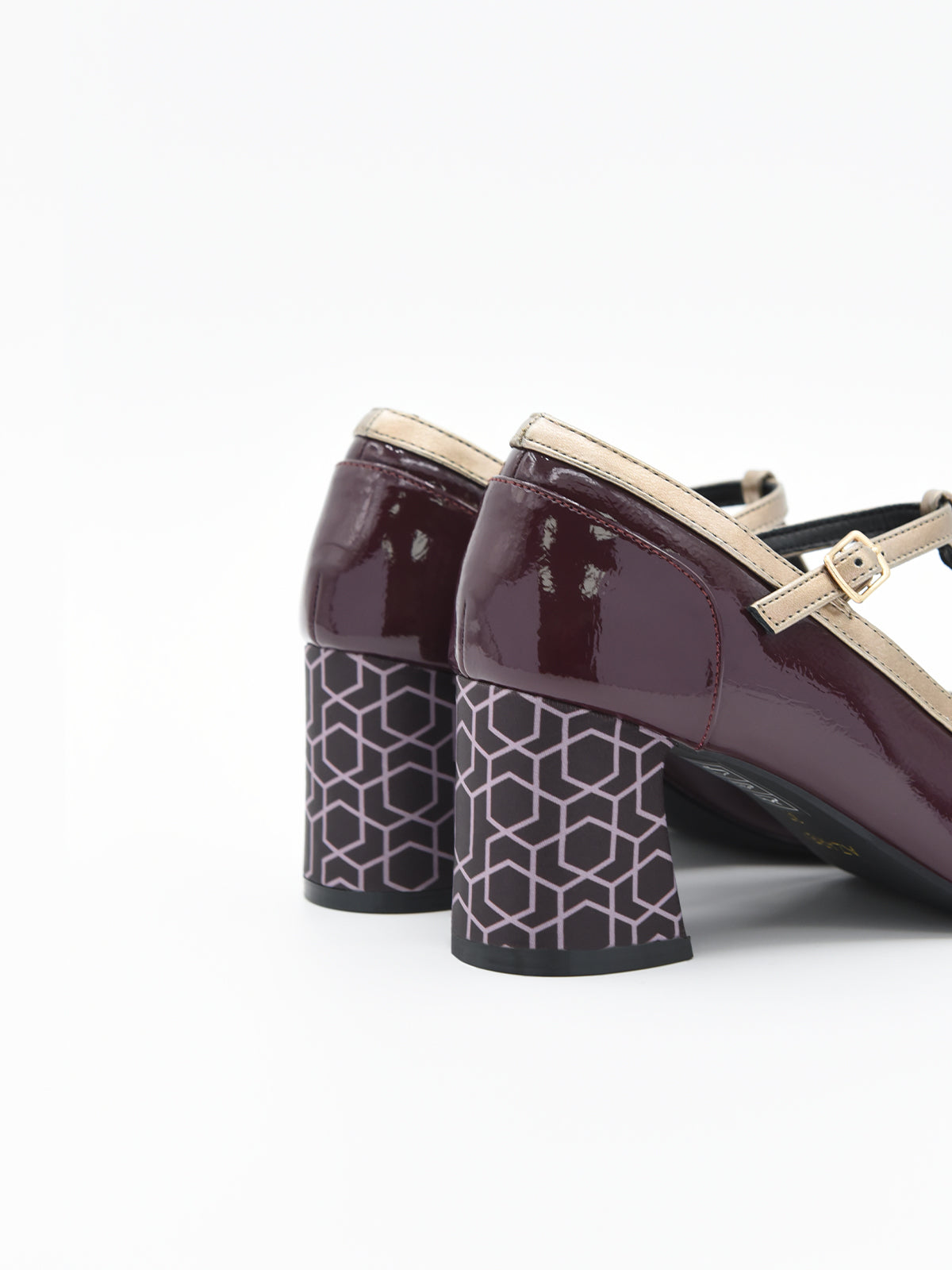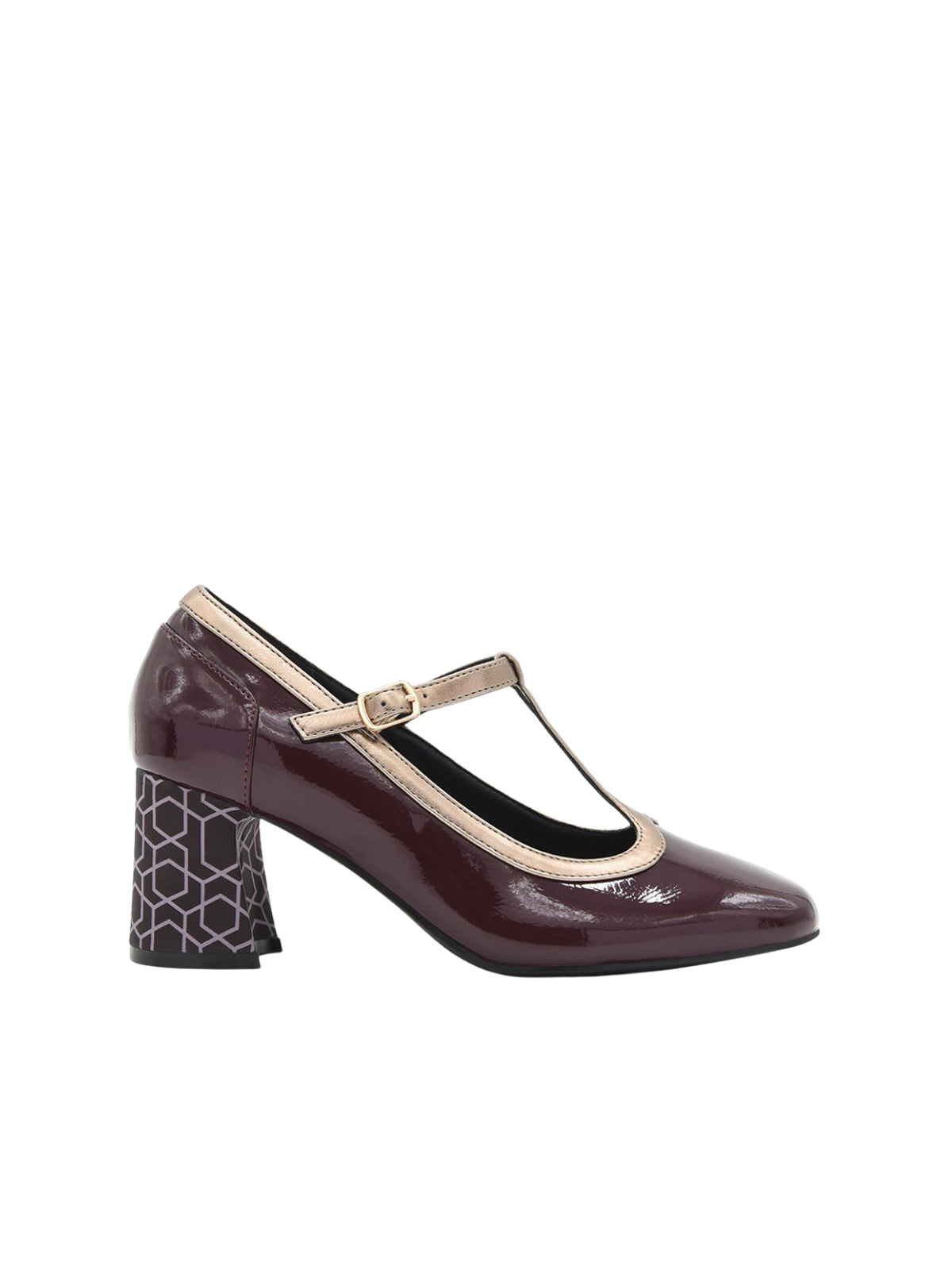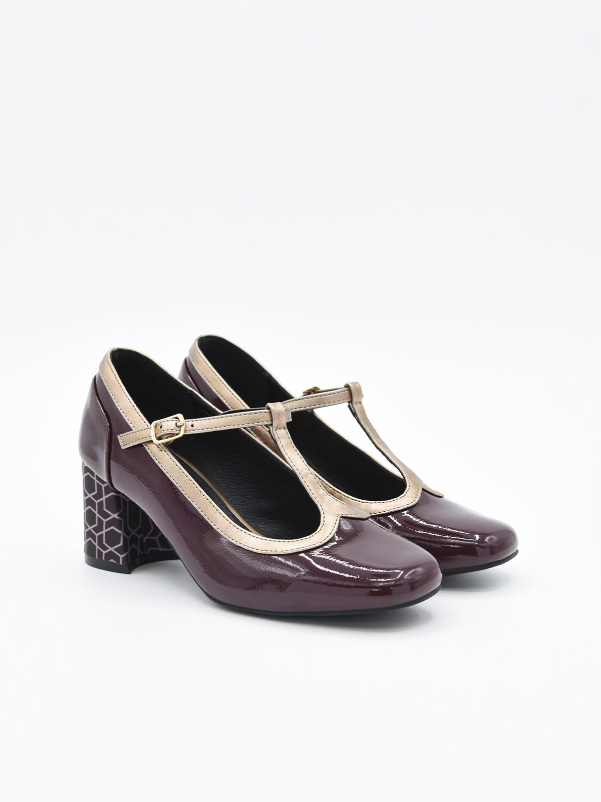 Sapato Mary Jane Bordeaux com acabamento dourado e salto retrô