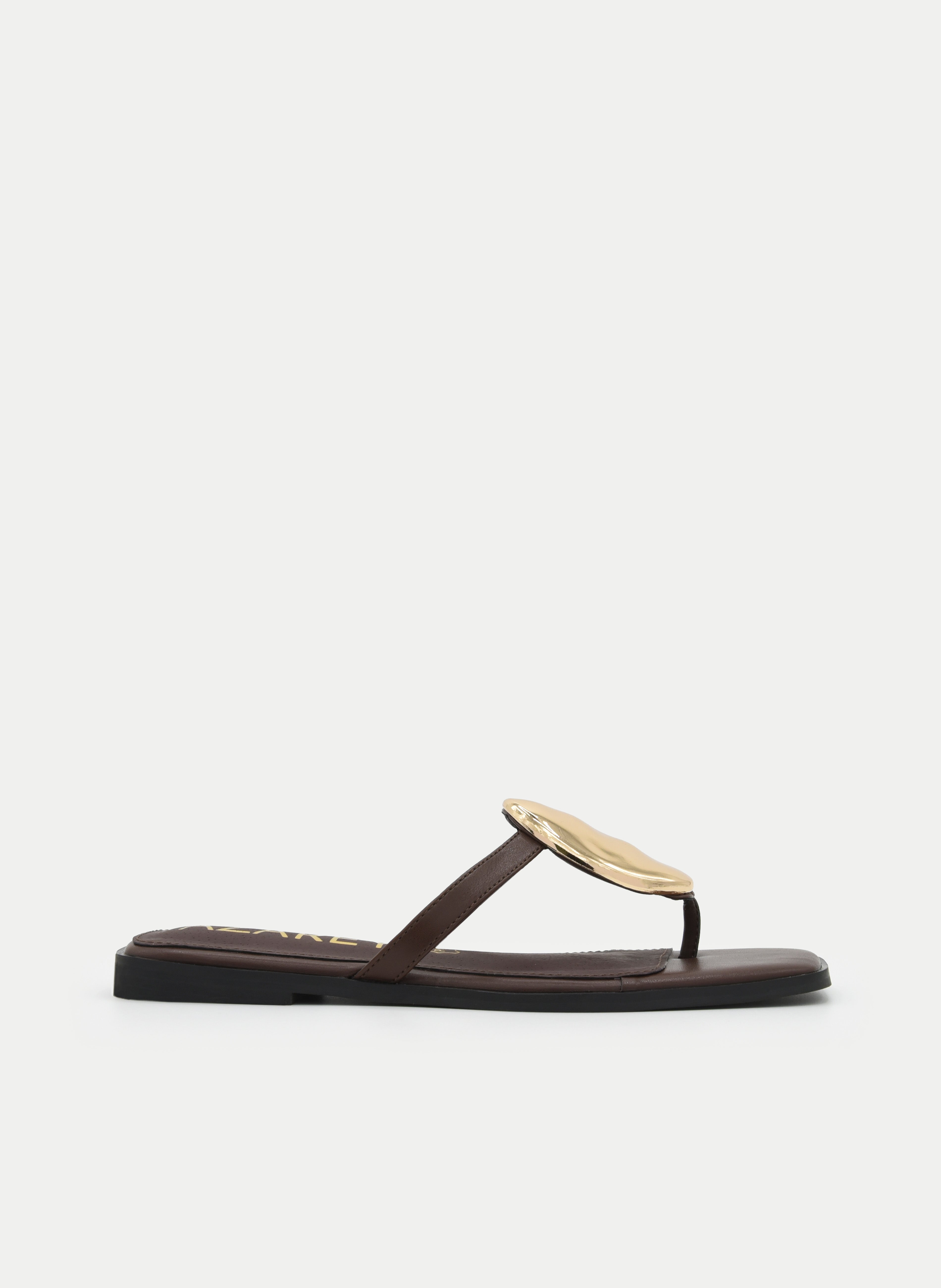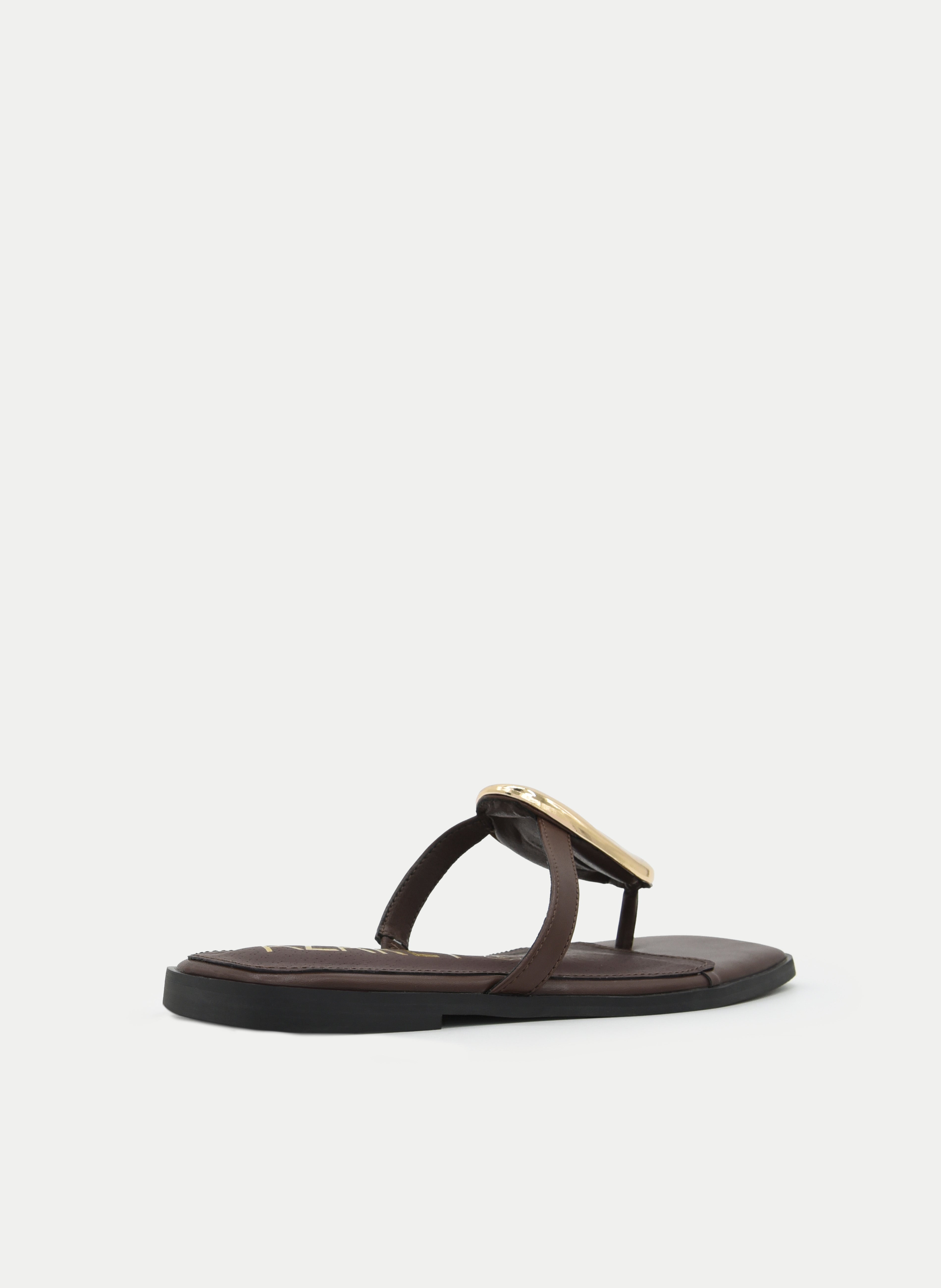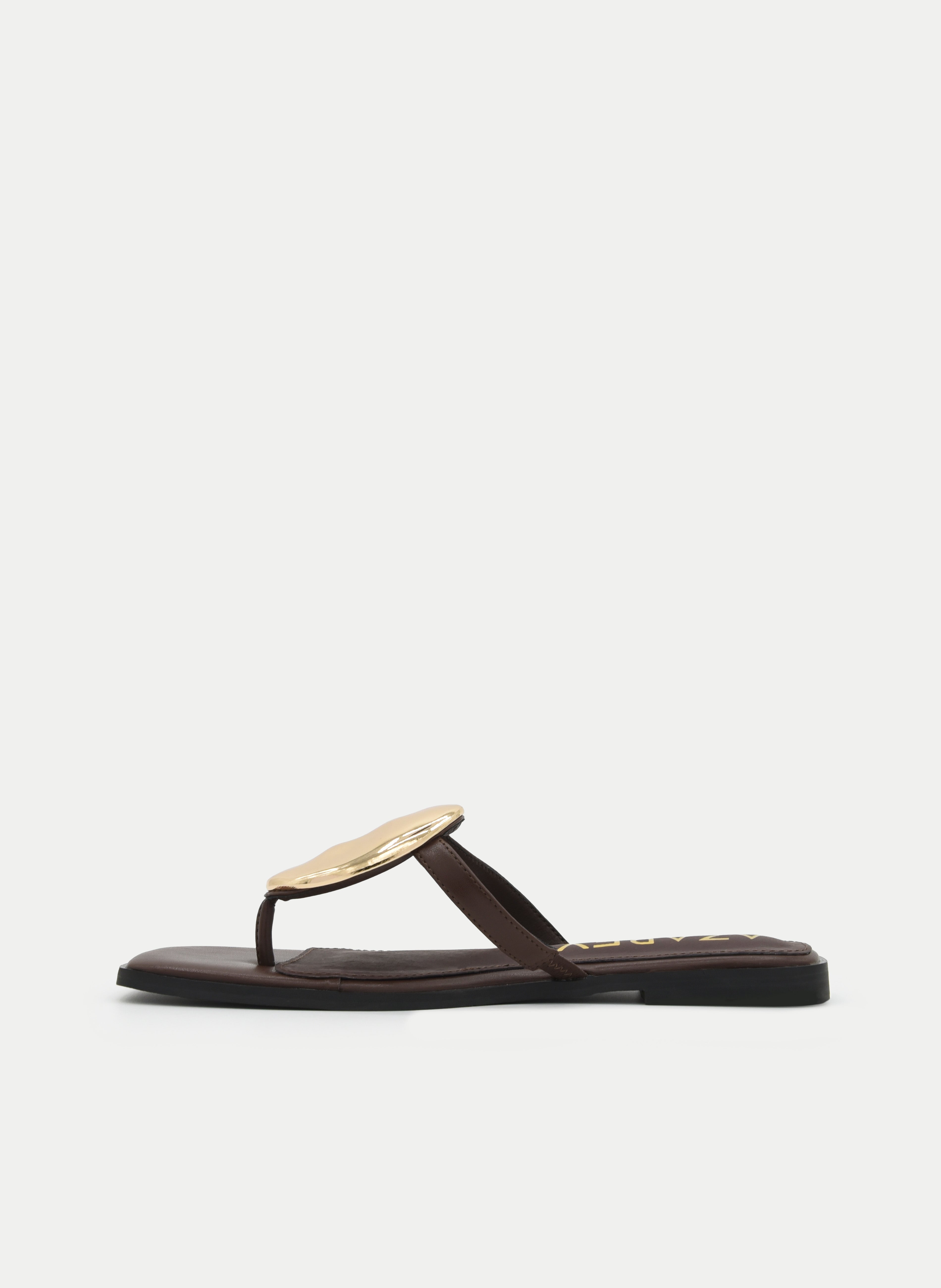 Sandália marrom com detalhe dourado metalizado e palmilha de couro.